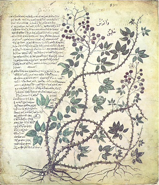 Text describing the uses of medicinal plants with an illustration of European bramble. From Dioscorides (1st century CE), De materia medica (Vienna Dioscorides; Byzantine, ca. 515 CE), fol. 83r. Österreichische Nationalbibliothek: Codex Vindobonensis Med. gr. 1. Photo: © ÖNB Vienna.