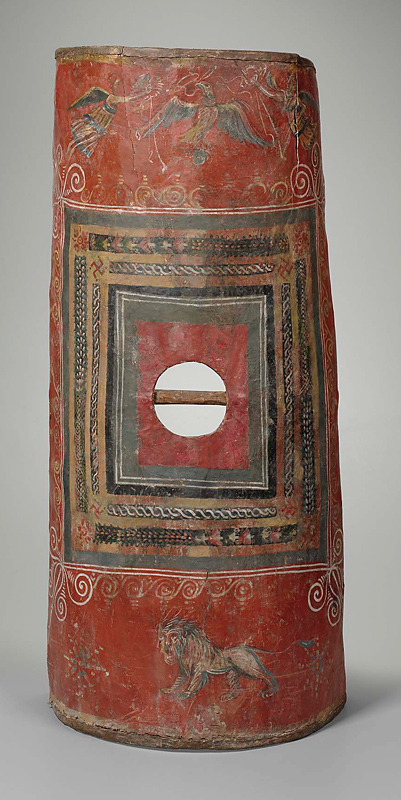 This painted shield is the best-preserved example of the classic shield used by Roman legionaries. Only the metal boss (umbo) that originally covered the handle is missing. The painted decoration reflects Roman iconography of victory and includes an eagle with a laurel wreath, winged victories, and a heraldic striding lion. While the shield has a clear utilitarian function, the painting is expressive, especially the depiction of the lion’s face, and very skillful.