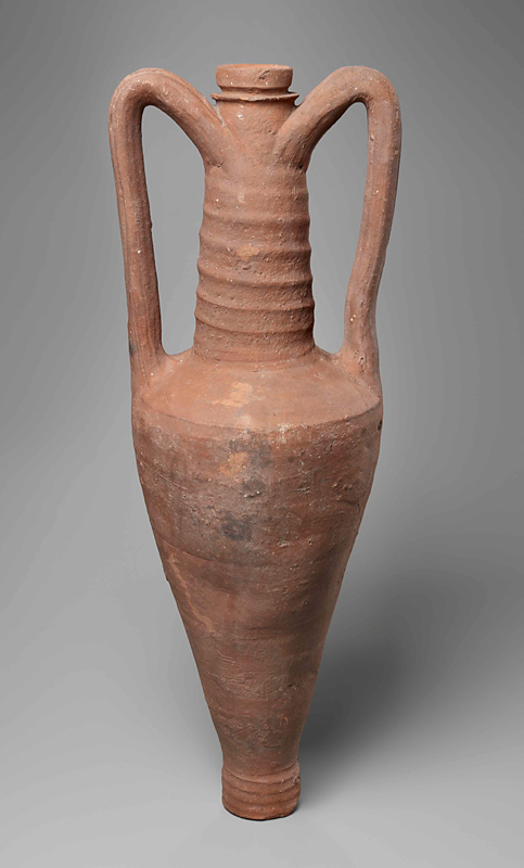 Many ancient Mediterranean cultures used amphoras, large two-handled ceramic jars, to carry liquid goods, such as olive oil, wine, or fish-sauce. Each amphora type is regionally specific; since the type seen here is most commonly found on sites near the Aegean Sea, the vessel and the product it carried both likely came from that area. Its presence at Dura-Europos is a clear indication of the town’s extensive economic contact with the Mediterranean region in the Roman period.