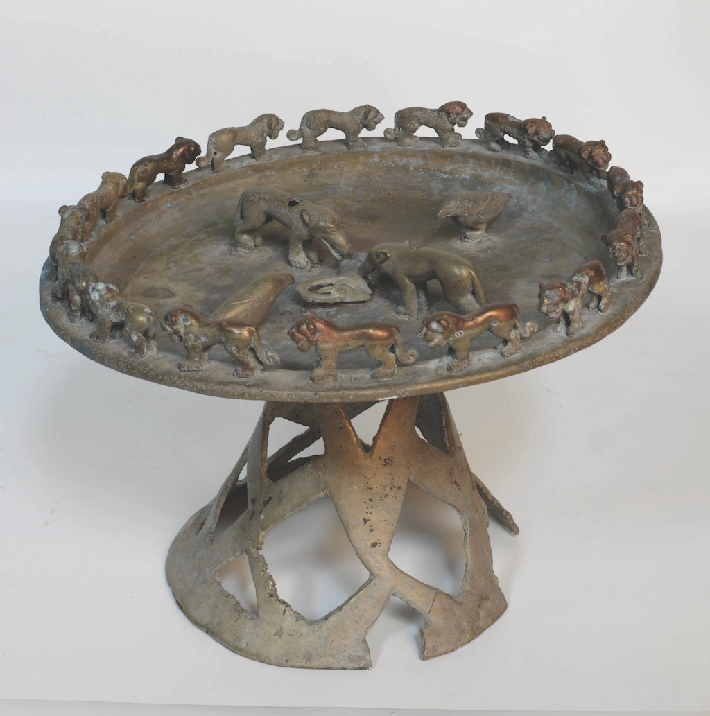 Round Tray on Conical Stand with Figures of Two Wolves and Two Ravens around Prone Ibex in Center and Sixteen Snow Leopards around Rim