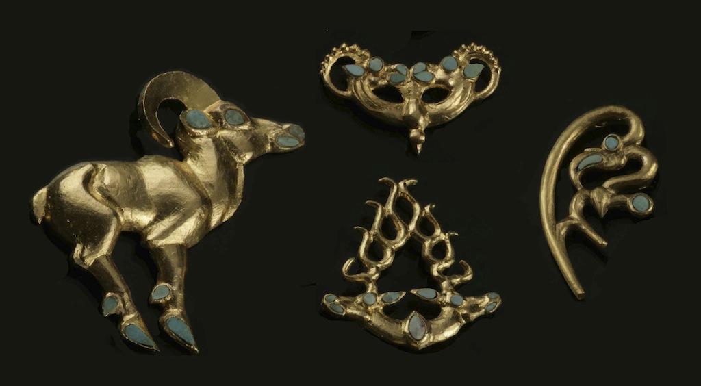 These plaques come from a rich burial excavated in 2003-2004. The Scytho-Siberian animal style can be quite naturalistic, as seen in the perched raptor or the mountain sheep standing on tiptoe. A more abstracting trend is called “zoomorphic juncture,” where parts of one animal are transformed into another, An especially sophisticated example of this is seen in the “Snow Leopard Mask,” which takes its name from the overall impression of a composition made up from two profile mountain goat heads and a soaring bird seen from above. The two voids below the goat horns form the ears of the leopard; the two voids between the chins of the goats and the wing of the birds are the leopard’s eyes; and the back of the bird forms the nose. In addition, the wings of the bird become the necks of the goat heads. The plaques from Shilikty are all cast in molds, and small gold loops were soldered onto the backs so they could be sewn onto clothing.