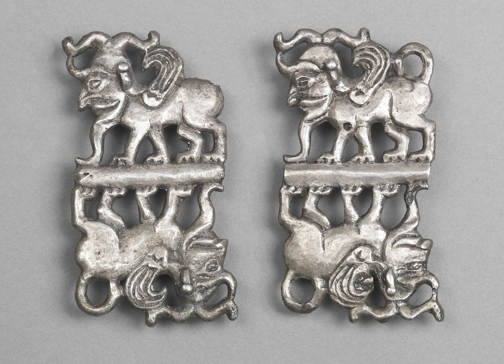 These plaques of sphinxes with lion bodies, bearded male heads wearing horned caps, and curved wings were inspired by Achaemenid representations. Since nomads tended not to work in silver, it is likely that these objects were imported directly from the Achaemenid world.