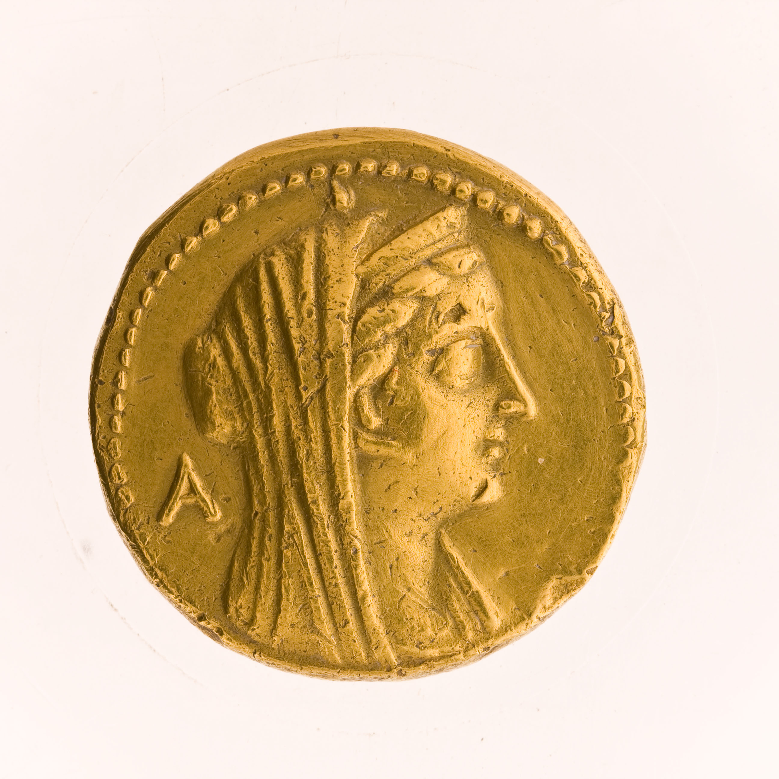Obverse: Head of Arsinoe III in the Guise of Arsinoe II. Reverse: Double Cornucopiae. Gold, Diam. 2.6 cm; 27.65 g. Minted in Alexandria, 212 BCE. American Numismatic Society: 1967.152.650.