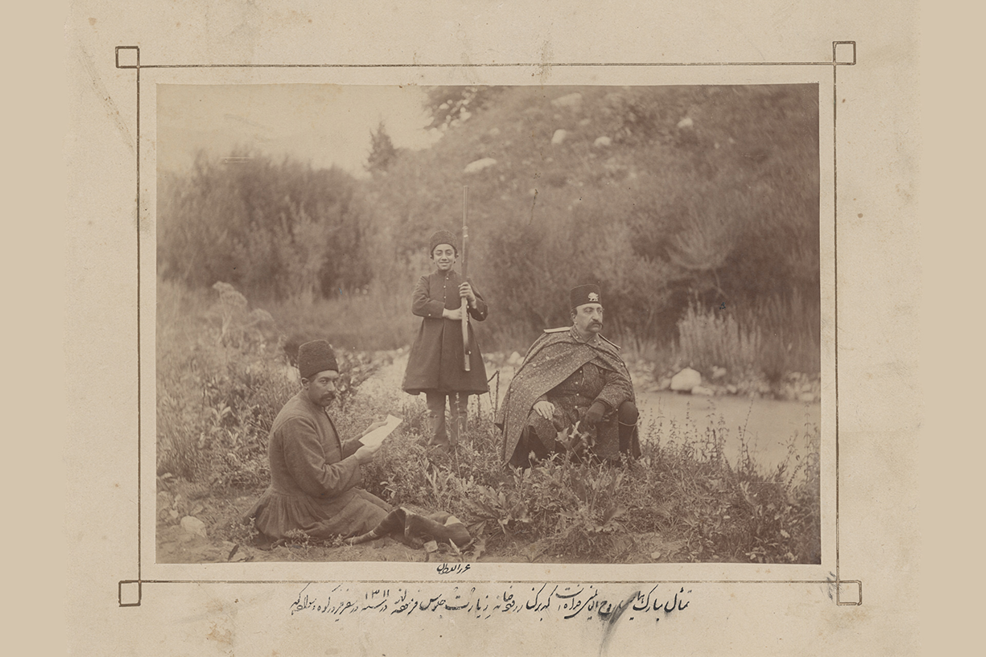 AMC-47 Naser al-Din Shah Qajar and 'Aziz al-Soltan, Golam 'Ali Khan (Malijak) by a River in the Plains of Alborz Mountain Range. Albumen print, ca. 1893 - 1894. Courtesy of The Archive of Modern Conflict, London.