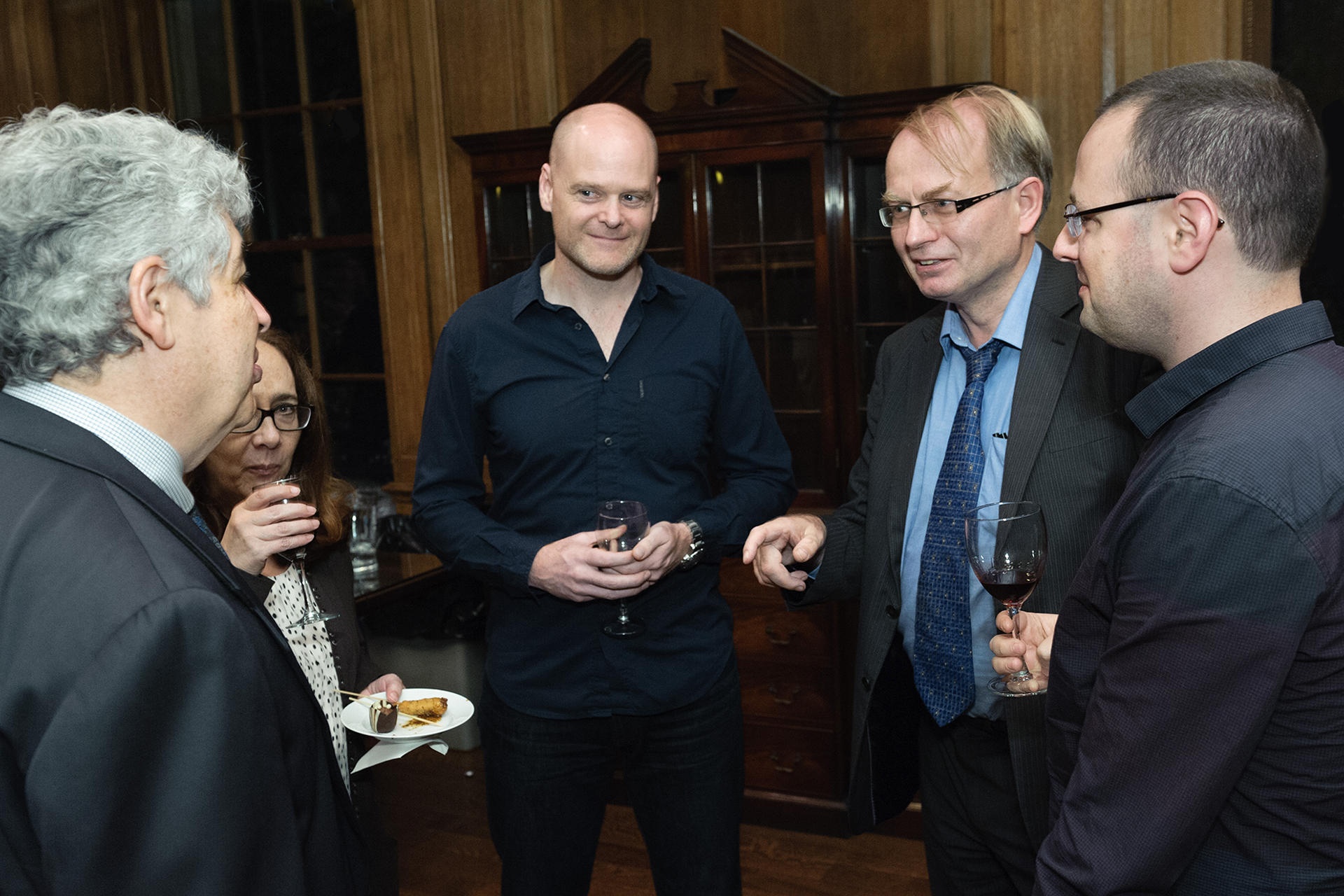 ISAW community members talking at a lecture reception