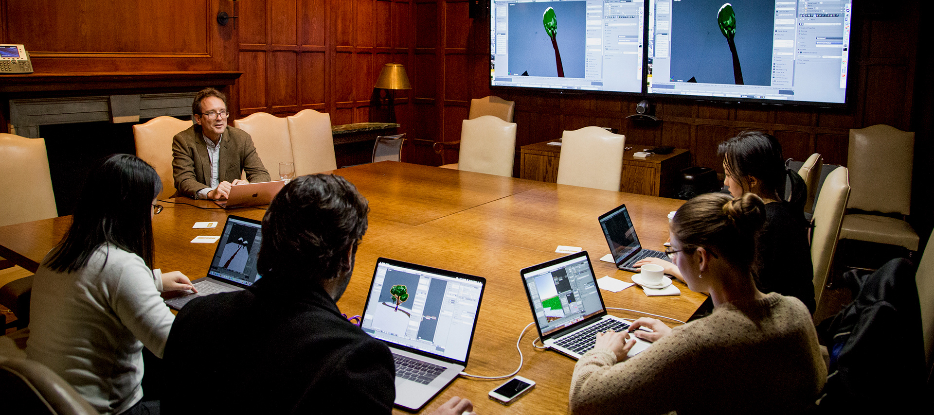 students and instructor sitting with laptops around a seminar table