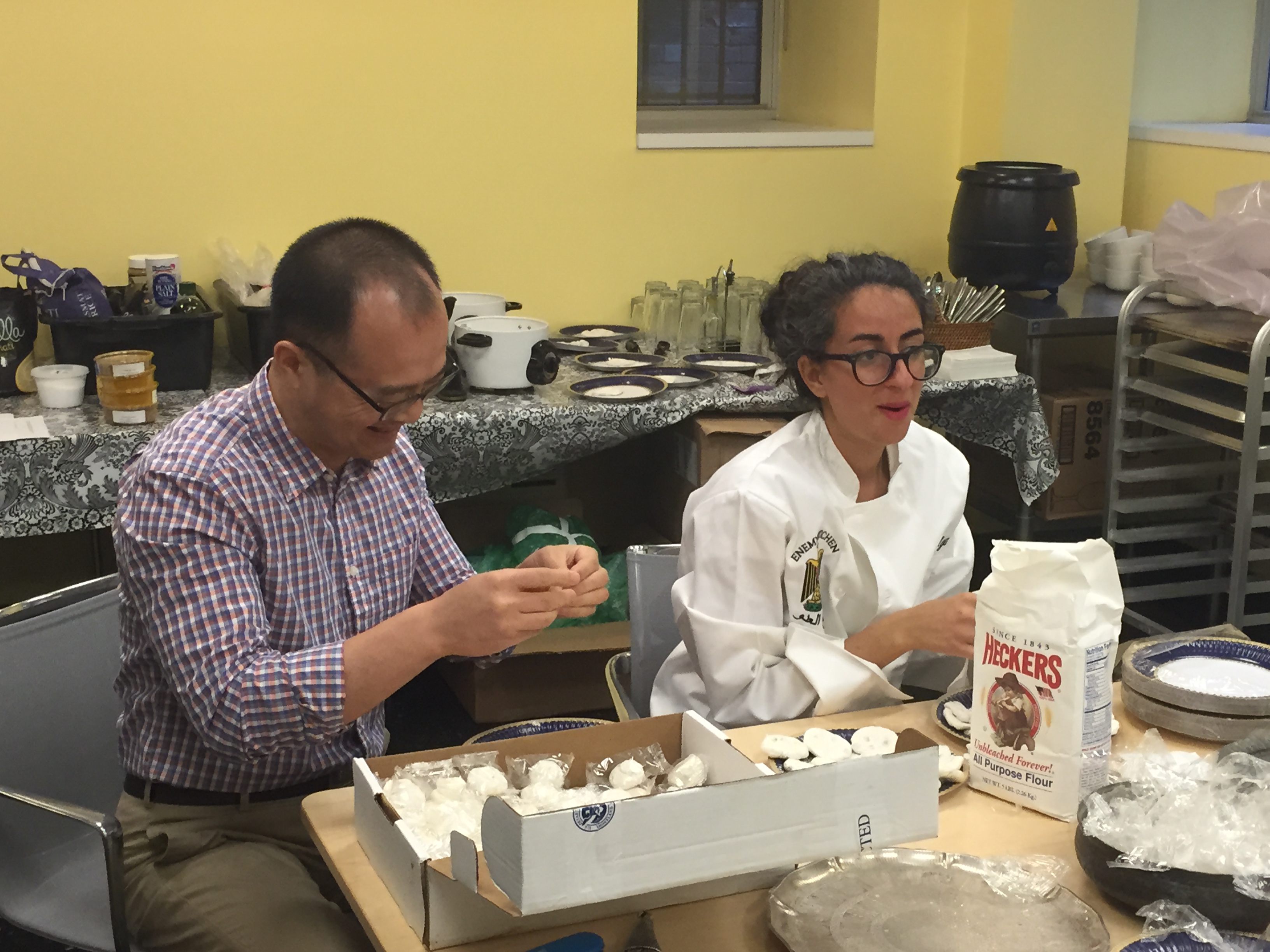 Junli Diao helping to make Puabi cylinder seal deserts for Michael Rakowitz's Enemy Kitchen, May 2015.