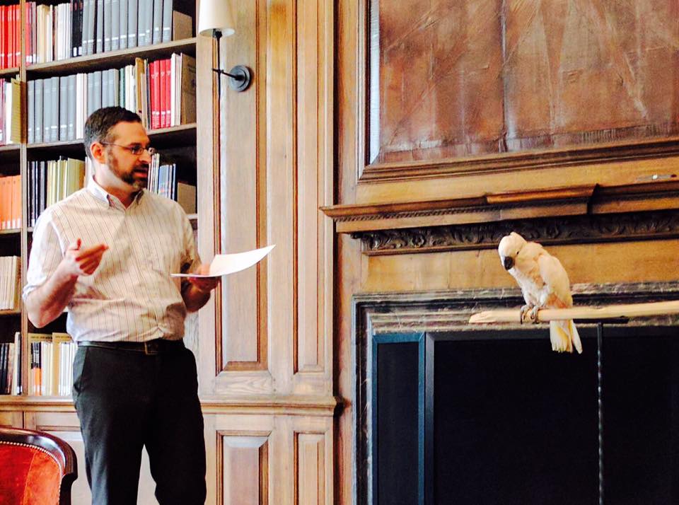 Patrick J. Burns gives a lecture on parrots in Greek and Roman literature in ISAW's Oak Library.