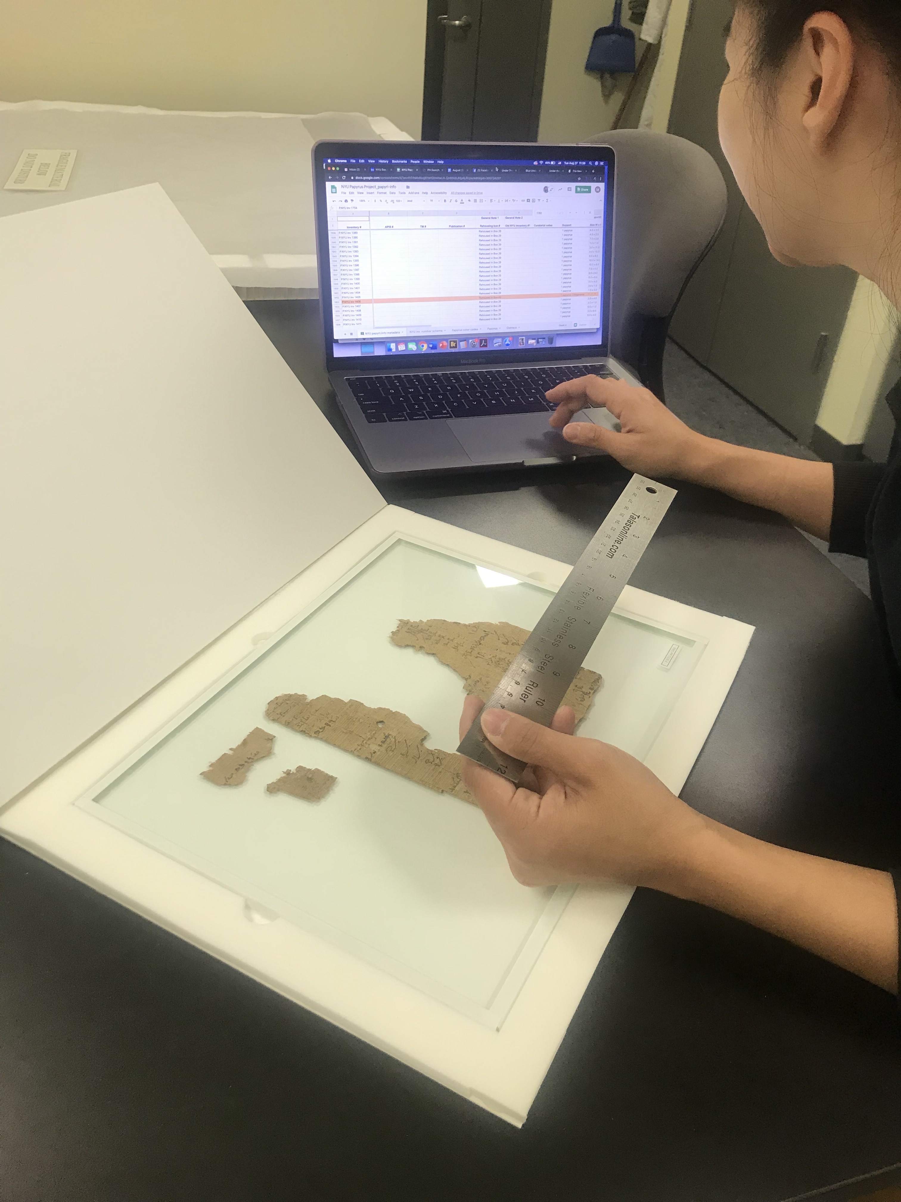 Melody Chen measures a papyrus in NYU Special Collections.