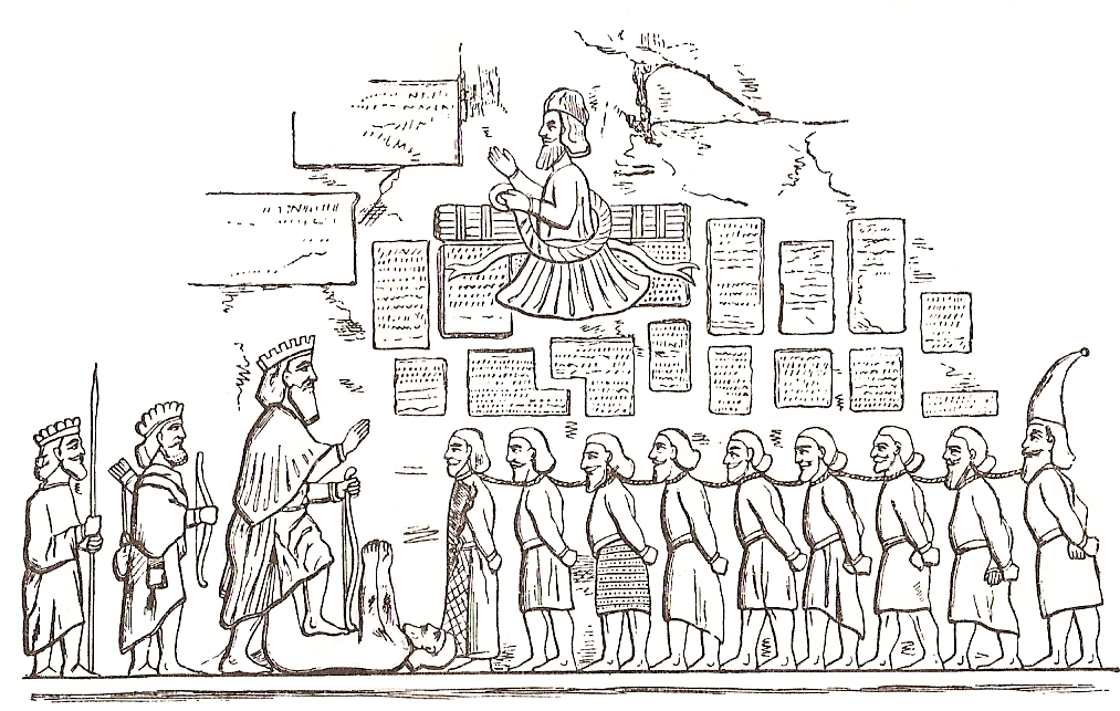 A schematic representation of the Behistun inscription, showing Darius and the rebels he defeated at the beginning of his reign. From Oskar Jäger, Weltgeschicte, Bd. 1: Geschichte des Altertums (ISAW call no. Small D20.J34 1887 Bd. 1), p. 77.