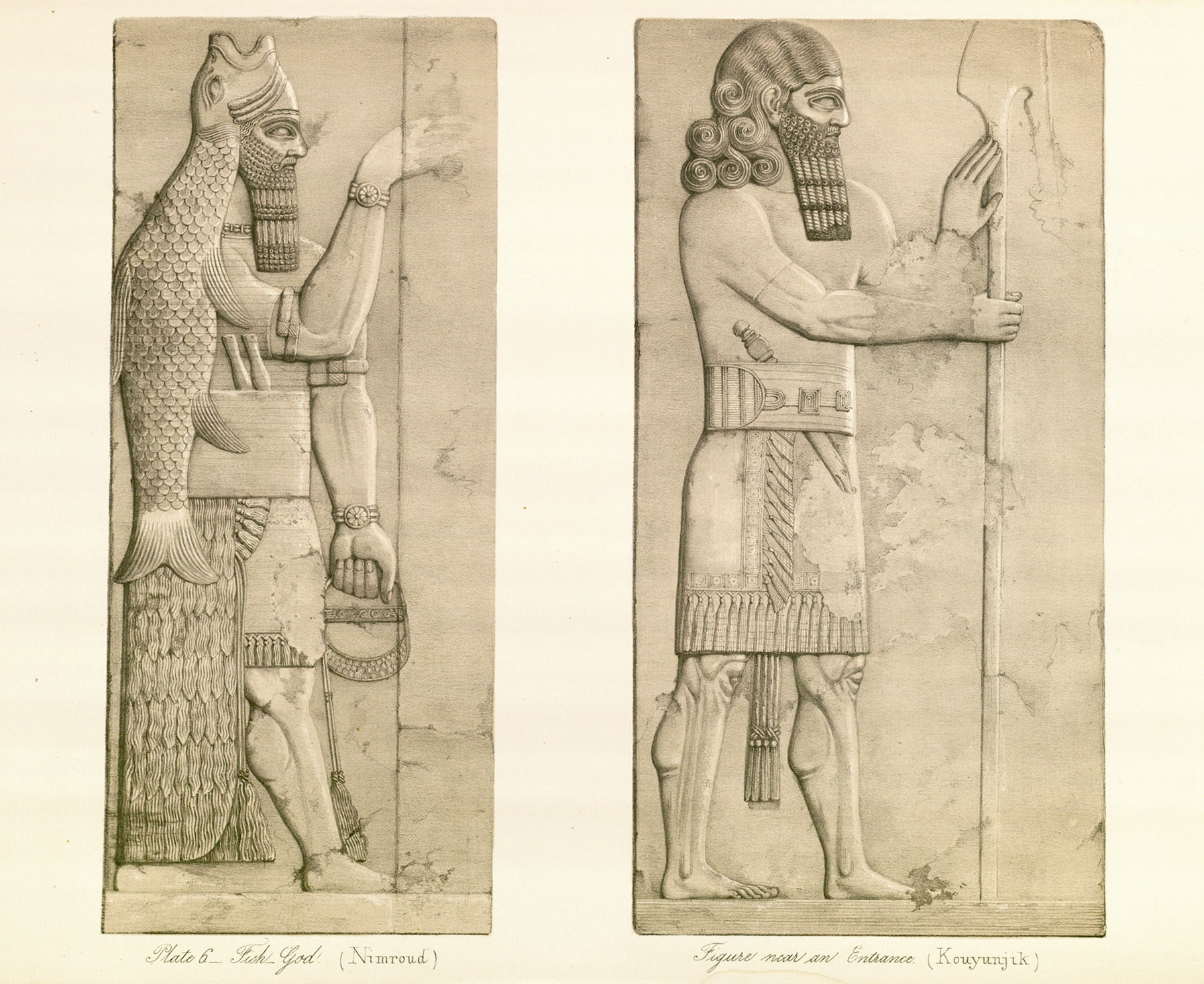 Fish God (Nimroud), Figure Near an Entrence (Kouyunjuk). From Austen Henry Layard. A Second Series of the Monuments of Nineveh. London: Murray, 1853, pl. 6.
