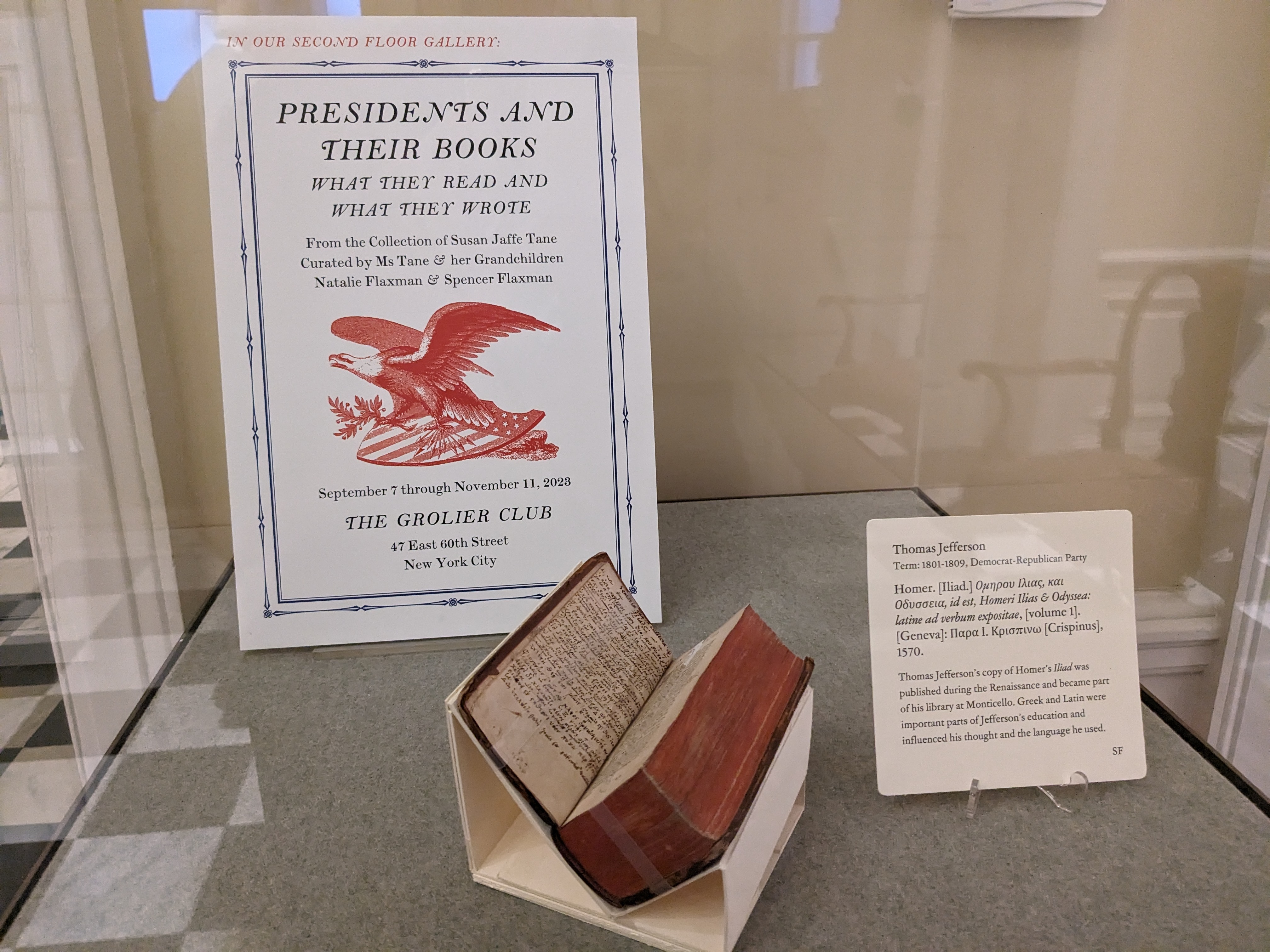 A display case containing Jefferson's copy of the Iliad, before a sign advertising the exhibition "Presidents and Their Books."