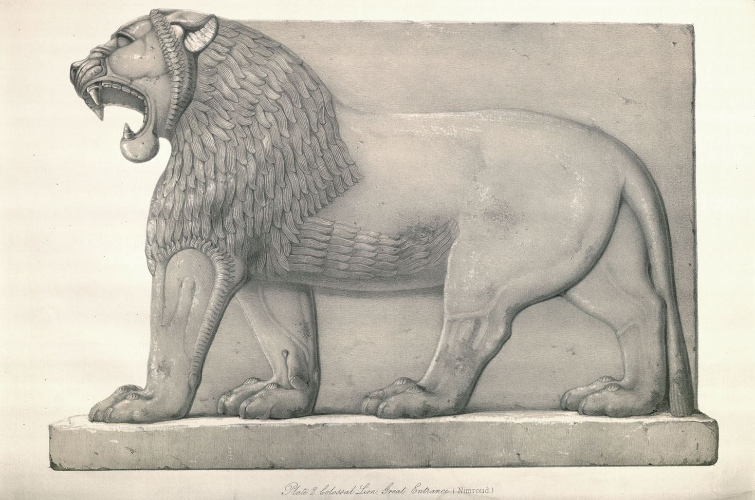 Colossal Lion, Great Entrance (Nimroud). From Austen Henry Layard. A Second Series of the Monuments of Nineveh. London: Murray, 1853, pl. 2.