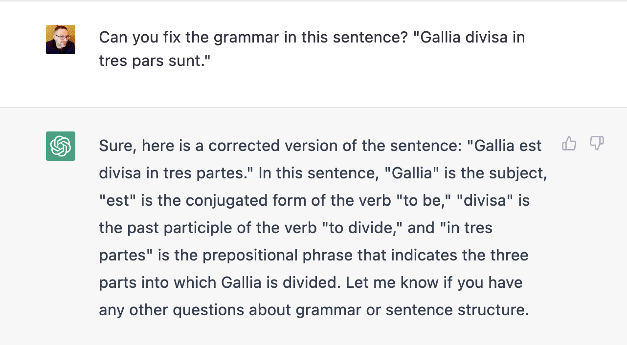 An example of ChatGPT correcting the grammar of a simple Latin sentence.