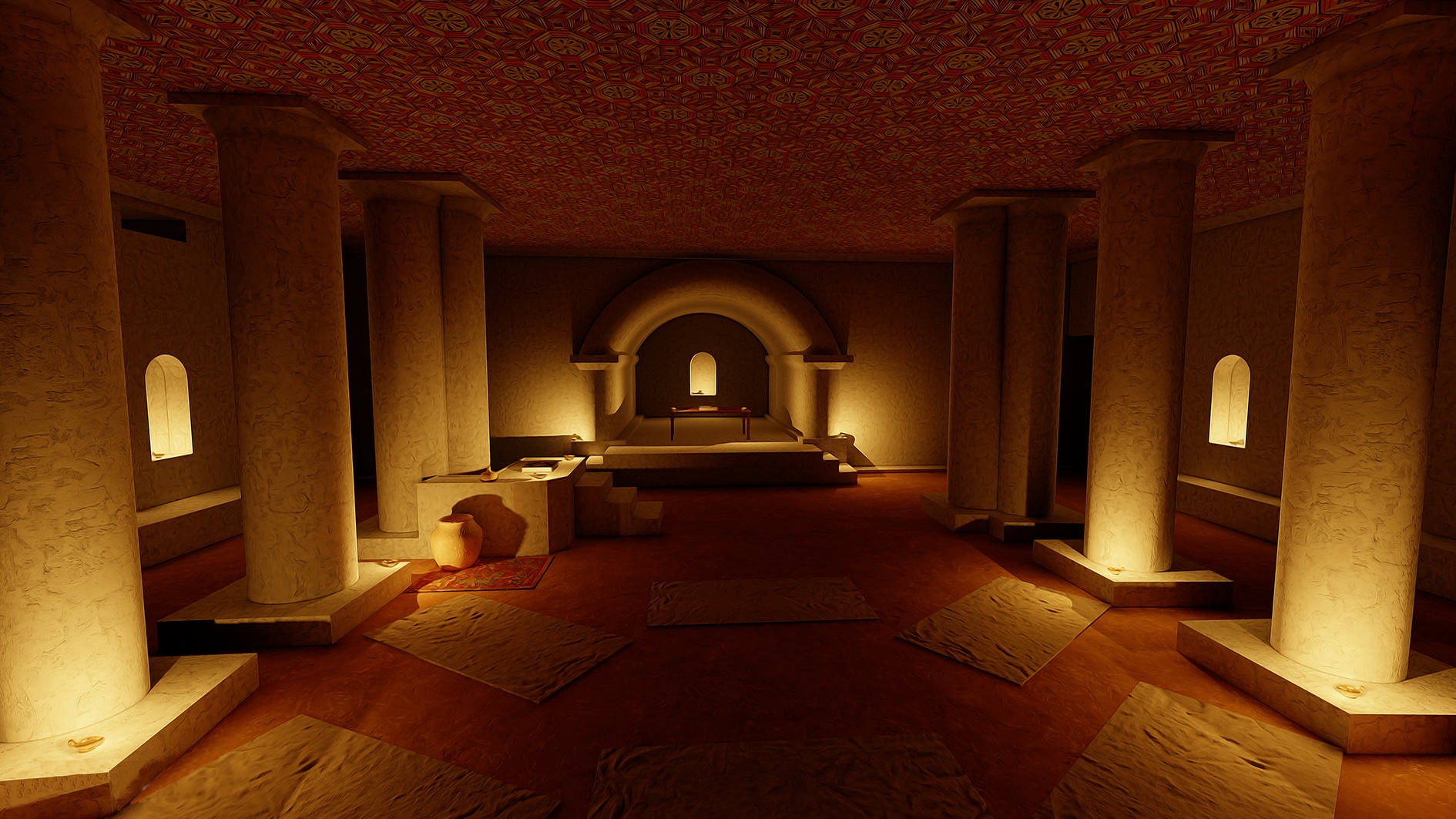 Hypothetical reconstruction of the interior of the church at Trimithis at night. Source: C. Ullendorff, in N. Aravecchia, Early Christianity at Amheida (Egypt's Dakhla Oasis), A Fourth-Century Church (Amheida VII), ISAW/NYU Press, 2024, Fig. 6. 14. Credit: The NYU Amheida Excavations.