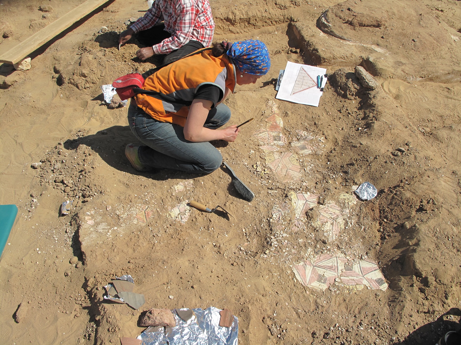 Conservators and illustrators working on fragments of collapsed painted ceiling in Room 1. Source: N. Aravecchia, Early Christianity at Amheida (Egypt's Dakhla Oasis), A Fourth-Century Church (Amheida VII), ISAW/NYU Press, 2024, Fig. 6.3. Credit: The NYU Amheida Excavations.