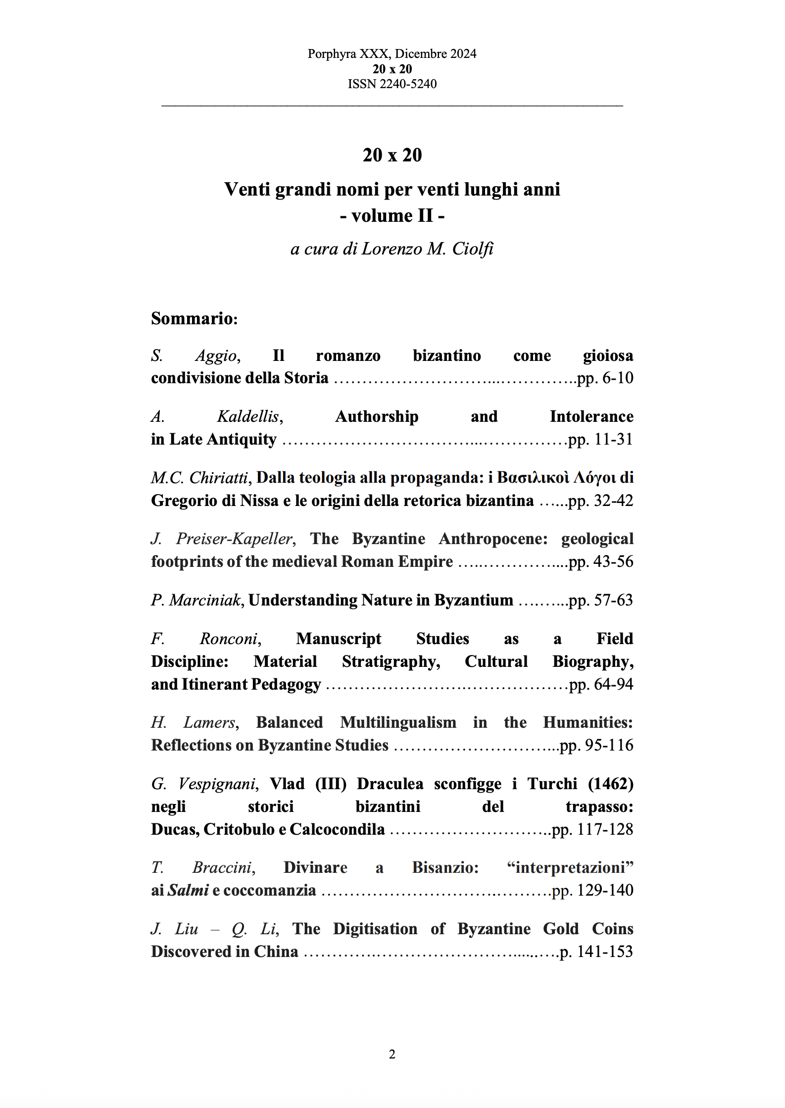 - First posted in AWOL 22 September 2011. Updated 30 July 2013]. Porphyra: la prima rivista online sul mondo di Bisanzio. ISSN: 2240-5240. WHAT IS PORPHYRA. Porphyra is the first Italian on-line magazine to focus exclusively on Byzantium. Founded in 2003 by Nicola Bergamo, it is currently one of tha many ways through which the. Associazione Culturale Bisanzio fosters and promotes Byzantine history, culture and civilization. From March 2006 until December 2011 it has been directed by Matteo Broggini. From January 2012 to present the director is Nicola Bergamo. THE AIMS OF PORPHYRA. Porphyra publishes and divulges articles and essays of high scientific value, always approved by. a committe of the most esteemed academic members worldwide. Master degree or PhD are the. criteria required to publish, along with thorough research, passion and method. Our aim is to contribute to the transimission of an accurate knowledge and perception of what. Byzantine culture was, and of its connections with both, our past and our present. We also aim at. fostering the awareness of how much our culture has inherited from the Eastern Roman Empire. Numero 1, (numero di prova)Numero 2, L’Italia bizantinaNumero 3, L’Impero di GiustinianoNumero 4, Costantino il GrandeNumero 5, L’Impero dei Comneni 1081-1180Numero 6, Bisanzio, narrazione di una civiltà coltaNumero 7, I Paleologi, l’ultima dinastia di Bisanzio 1259-1453Numero 8, L’Esarcato 554-751Numero 9, L’età macedone: dotti, militari, patriarchiNumero 10, La Siria bizantinaNumero 11, Venezia e BisanzioNumero 12, Eraclio 610-641Numero 13, L’Ortodossia Numero 14, Arte, scienza a BisanzioNumero 15, La tyrannisNumero 16, Atti del convegno "Bisanzio e Venezia, intrecci millenari tra storia e leggenda", San Servolo 4-5 dicembre 2010Numero 17, Atti del convegno, "Bisanzio e le Crociate", San Servolo 10-11 dicembre 2011Numero 18, La donna a BisanzioNumero 19, Homo Byzantinus.