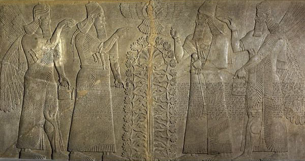 Wall relief from the Throne Room in Ashurnasirpal II’s Northwest Palace at Nimrud showing the sacred tree flanked by two representations of the king who again is accompanied by genii performing pollination (British Museum 124531)