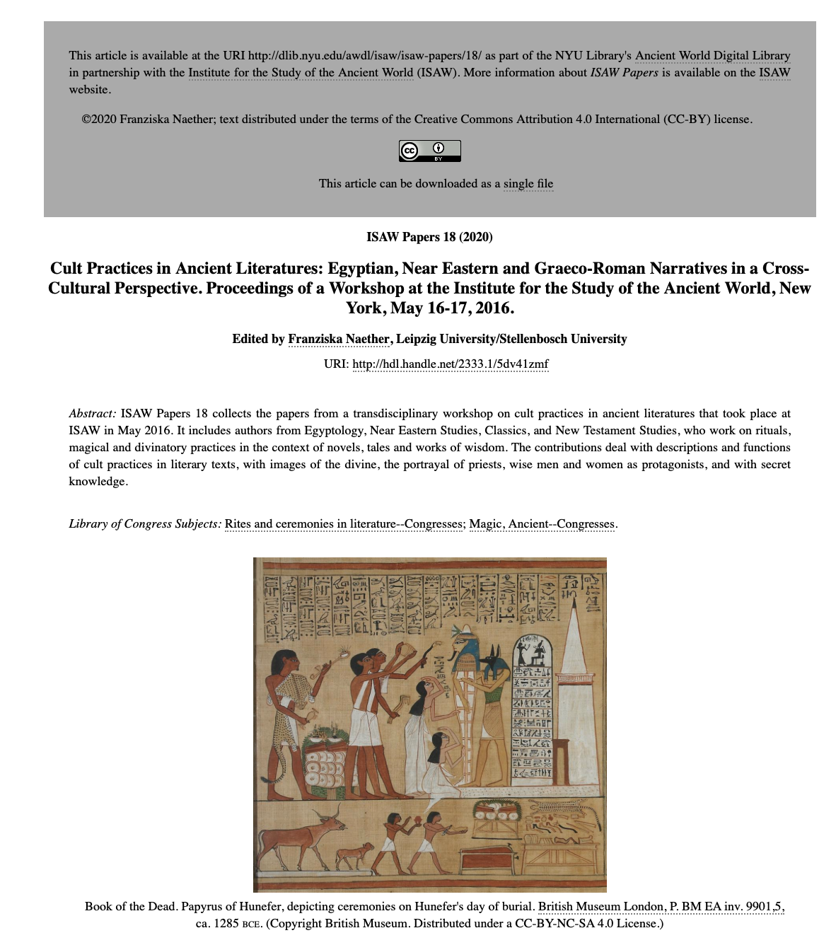 Page cover: Cult Practices in Ancient Literatures: Egyptian, Near Eastern and Graeco-Roman Narratives in a Cross-Cultural Perspective. Proceedings of a Workshop at the Institute for the Study of the Ancient World by Franziska Naether